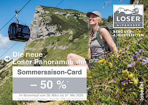 | Ausseerland Sommerclou-Card | ![]() | 1x tgl. Auffahrt gratis | Wir sind Verkaufsstelle!Gerne informieren wir Sie an unserer Kassa Panoramabahn |